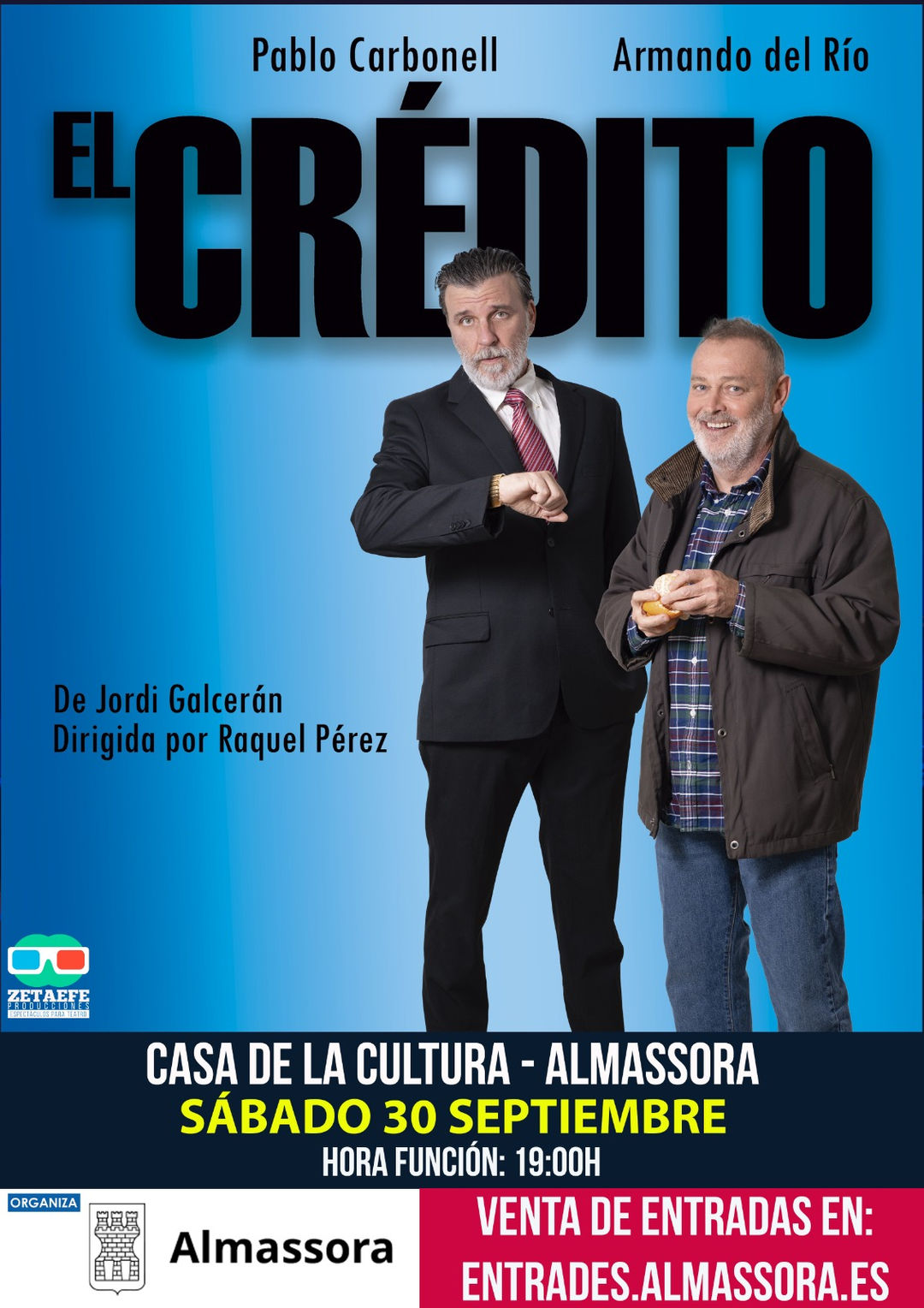 La Casa de la Cultura d'Almassora acollirà aquest pròxim dissabte, a les 19.00 hores, l'obra teatral El crèdit interpretada per dos reconeguts actors a nivell nacional com són Pablo Carbonell o Armant del Riu.