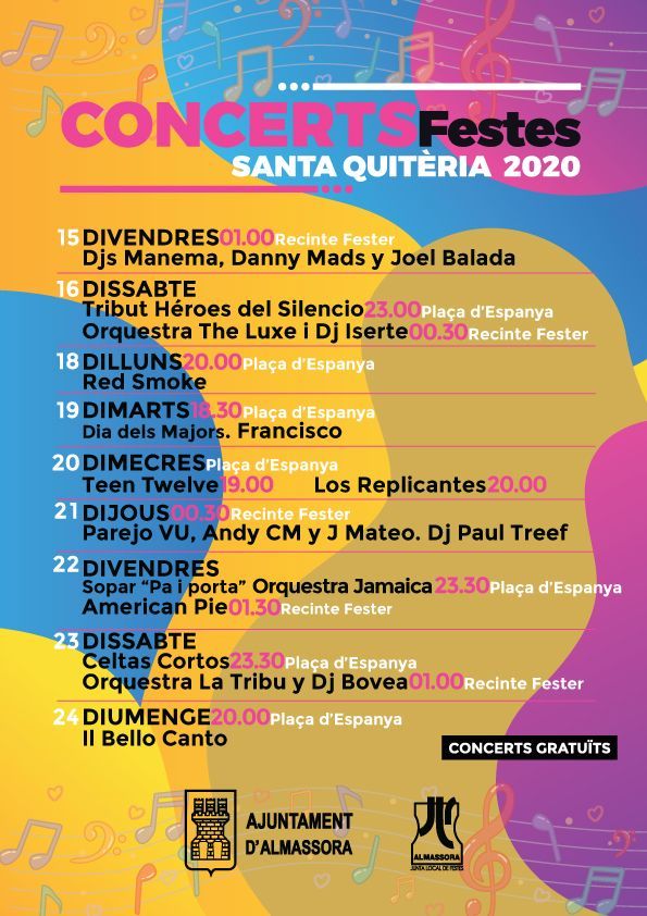 El Ayuntamiento de Almassora cerrará las fiestas con el concierto de Celtas Cortos el sábado 23 en la plaza de España (23.30h) y la orquesta La Tribu y dj Bovea en el Recinte Fester (1.00h). Por último, la jornada dominical llegará a su fin con la actuación de Il Bello Canto en la plaza de España a las 20.00h, acto previo al disparo del castillo de fuegos artificiales.