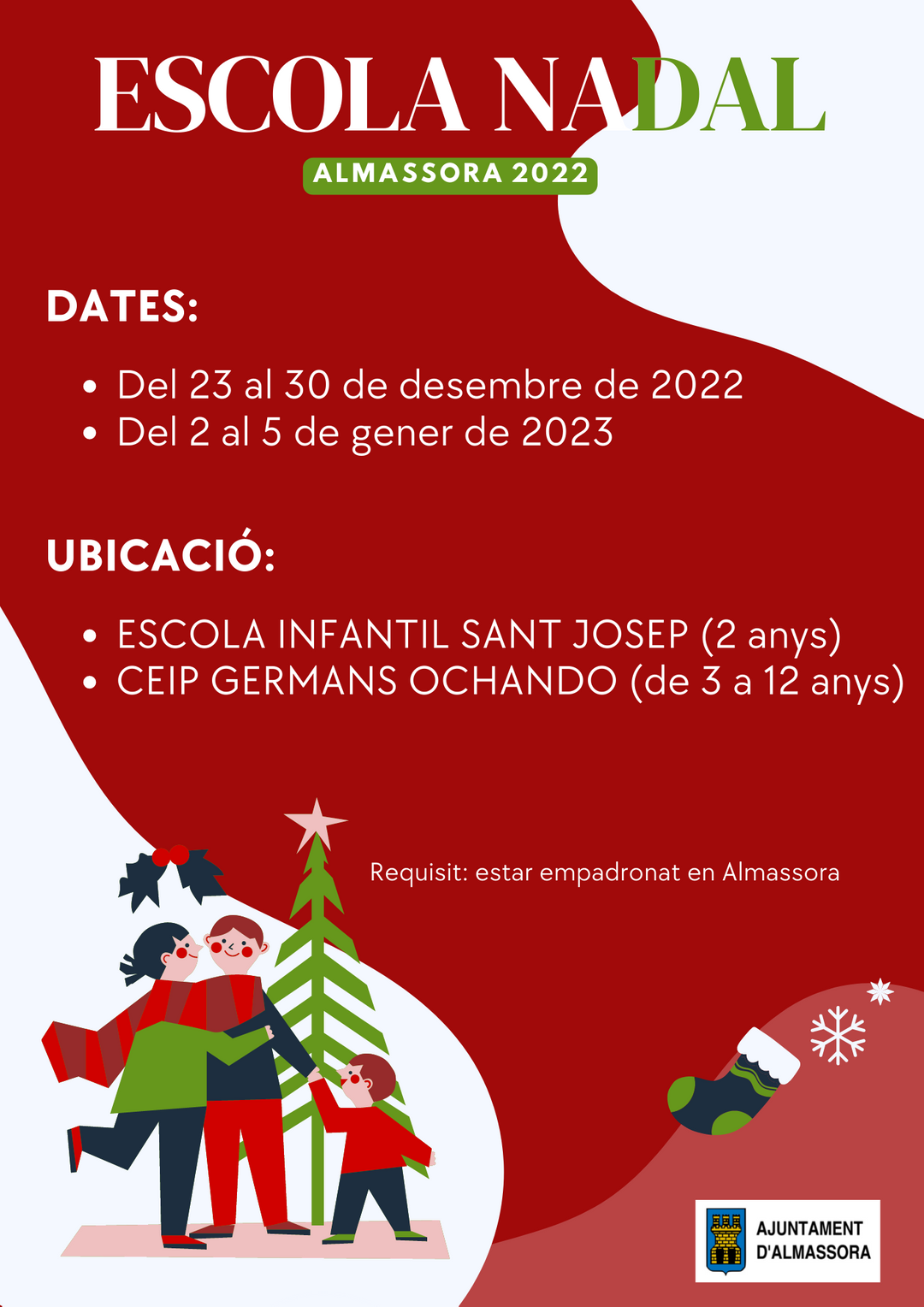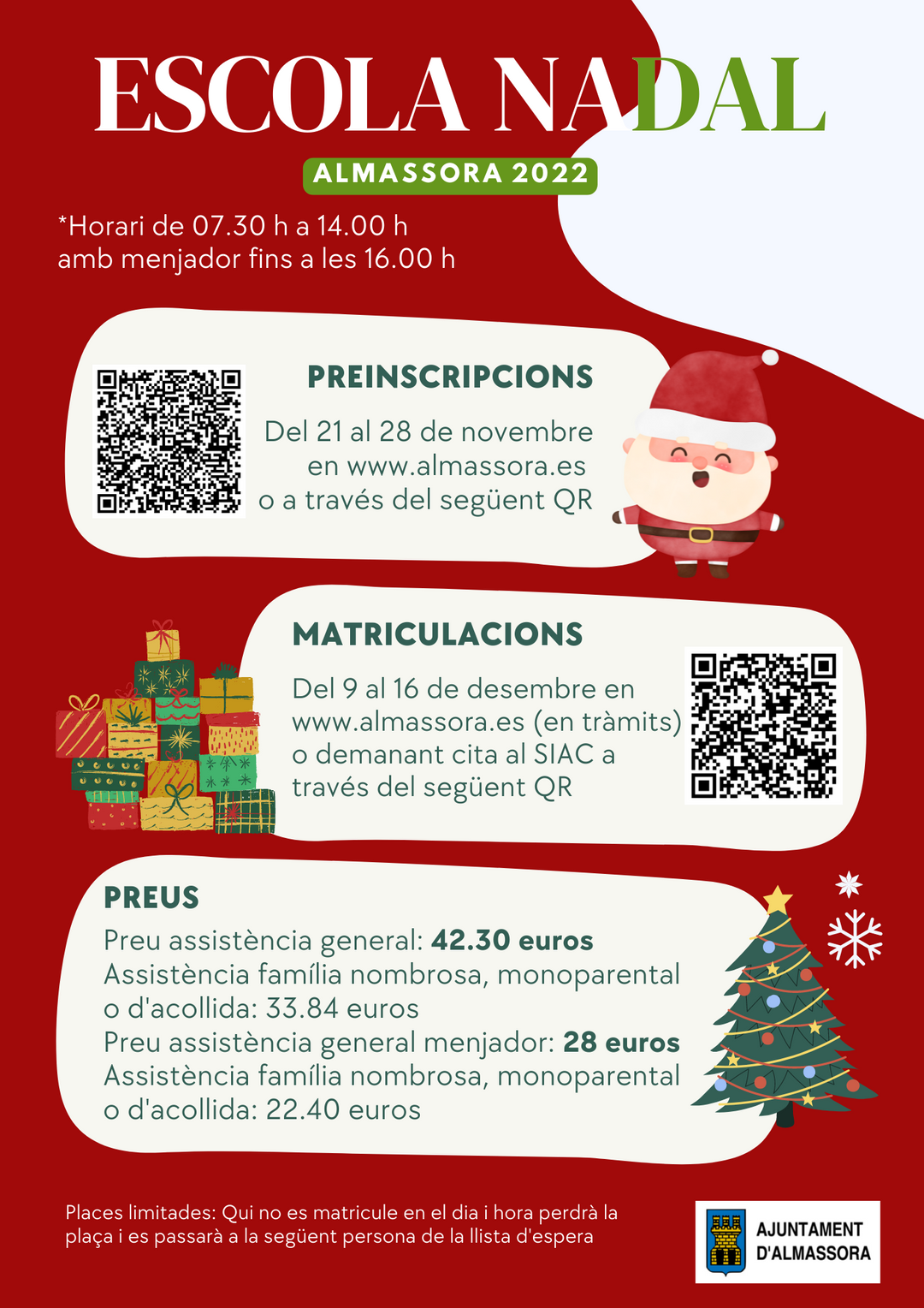 Cal recordar que l'únic requisit per a participar és que el menor estiga empadronat a Almassora. El consistori ha fixat els següents preus: 42,30 euros per a l'assistència general, 33,84 euros per a famílies nombroses, monoparentals o d'acolliment, 28 euros per al servei general de menjador i 22,40 euros el mateix servei però per a famílies nombroses, monoparentals o d'acolliment. L'horari de l’Escola de Nadal serà des de les 7.30 fins a les 14 hores, en el cas dels inscrits al menjador la seua hora d'eixida serà a les 16 hores.