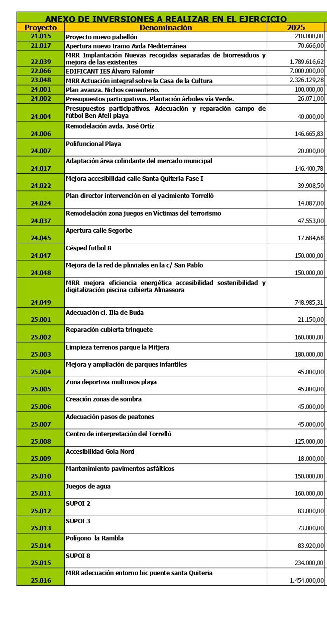 En el capítol 6 de gastos, Inversions Reals, s'han incorporat diferents necessitats i es continua amb les inversions previstes en anys anteriors afectades per subvencions de la Generalitat Valenciana, Fons Next Generation o FEDER que financen totalment o parcialment actuacions de millora d'accessibilitat i mobilitat sostenible, estructures educatives, millores en polígons i reformes en edificis municipals amb la finalitat d'avançar en l'eficiència energètica i l'accessibilitat. En total, es preveuen quasi mig centenar d'actuacions en l'apartat referit a les inversions.