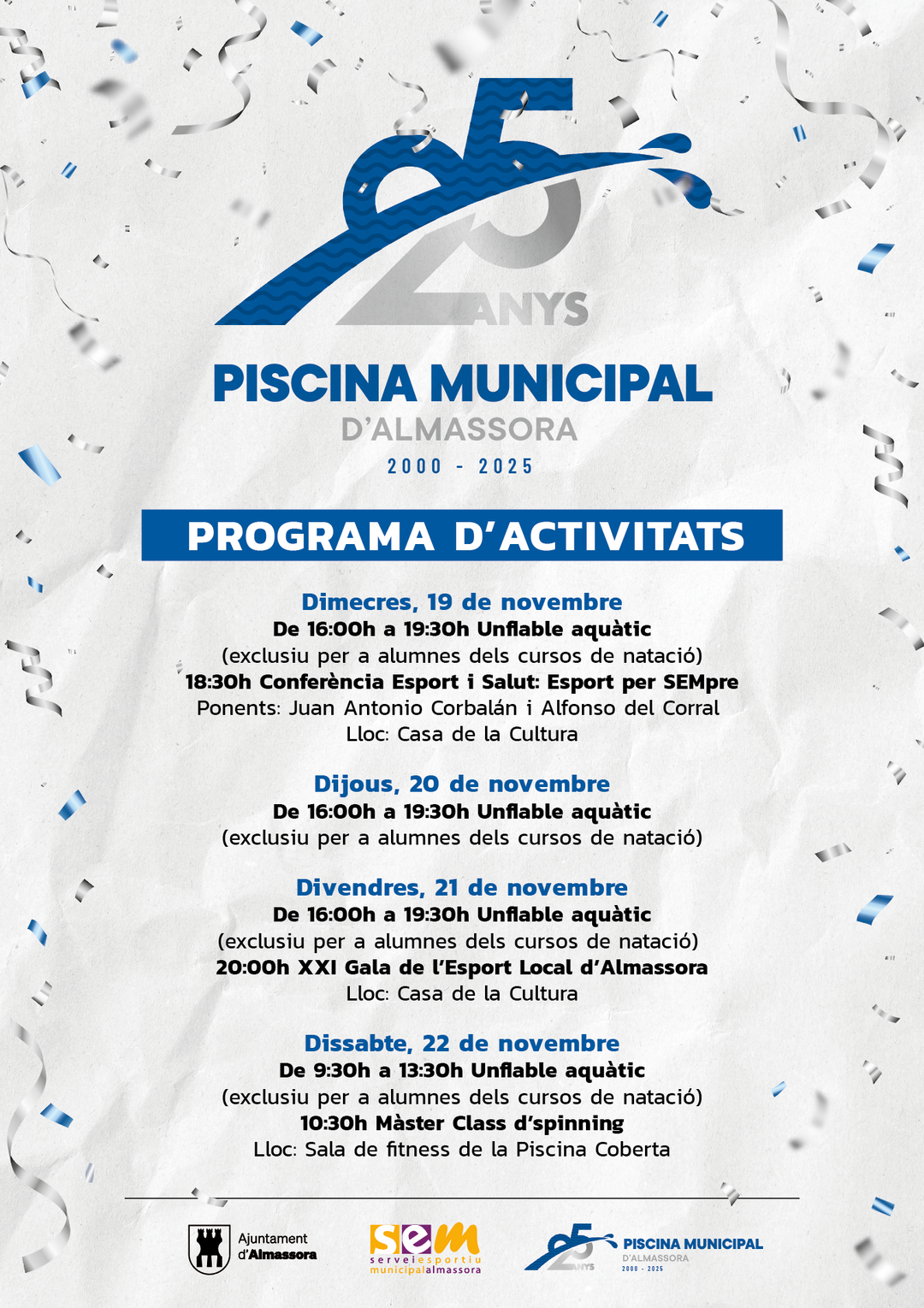 La piscina municipal d'Almassora commemora el seu 25é aniversari amb un complet programa d'activitats que es desenrotllarà del 19 al 22 de novembre. L'Ajuntament, a través del Servei Esportiu Municipal (SEM), ha organitzat una sèrie de propostes esportives, formatives i festives per a celebrar els 25 anys d'esta instal·lació, inaugurada l'any 2000 i que acaba de ser renovada, gràcies a una actuació integral finançada pel Pla de Recuperació, Transformació i Resiliència.