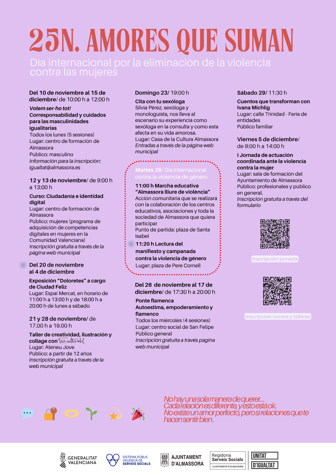 L'Ajuntament d'Almassora, a través de la Unitat d'Igualtat de la Regidoria de Benestar Social, ha llançat, amb motiu de la programació per al 25N, Dia Internacional de l'Eliminació de la Violència contra la Dona, una àmplia programació destinada, especialment, a la prevenció entre els més jóvens, sota el lema Amors que sumen. Una campanya pedagògica destinada als centres educatius que, tal com ha explicat la regidora de l'àrea, Eugenia Martinavarro, posa el focus en la construcció de relacions sanes entre la joventut.