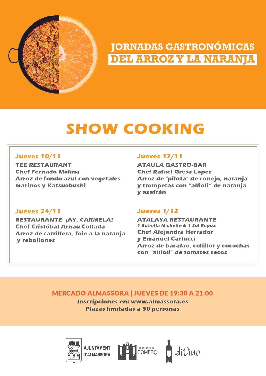 Així mateix, el regidor de Comerç, Javier Martí, ha declarat que “el Mercat Central tornarà a sumar quatre classes de cuina més de molt de nivell culinari, estem agraïts a tots els xefs participants que mostraran quatre arrossos diferents per als assistents”. “El veïnat d'Almassora que participe podrà veure per primera vegada en directe a uns cuiners guardonats amb l'Estrela Michelín i el Sol Repsol en el nostre municipi”, ha afirmat l'edil.