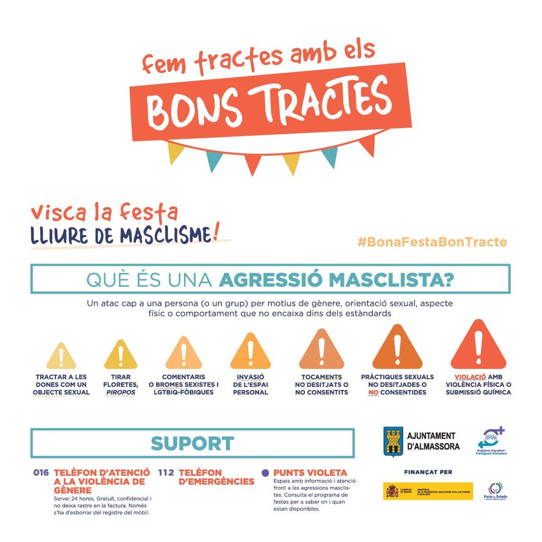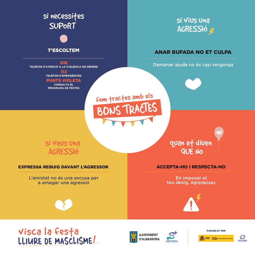 El compromís municipal per a treballar cap a una societat igualitària, en el qual es respecten els drets de totes les persones, ha de tenir el seu reflex també a festes. Ni l'alcohol, la nit o la festa en si mateixa, són excusa perquè les relacions entre dones i homes (i per motius de identitat u orientació sexual) no siguen igualitàries i respectuoses.
