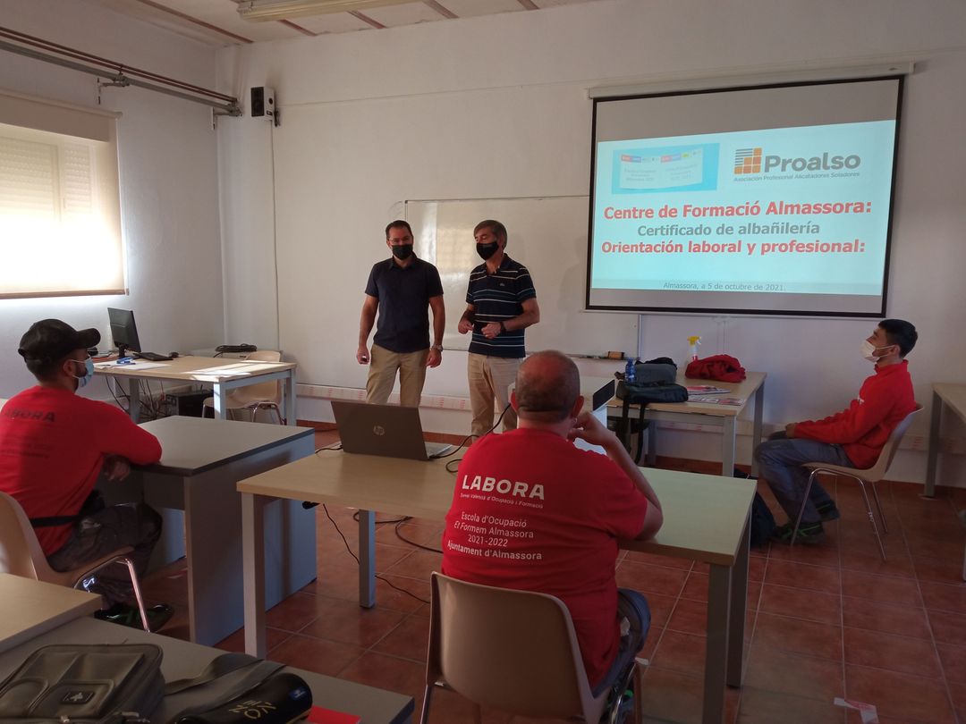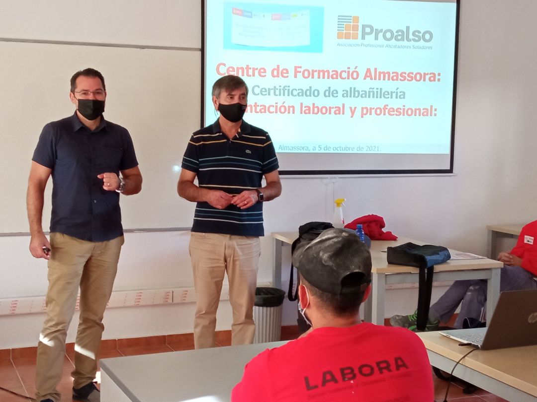 05/10/21 - Els alumnes/treballadors del Certificat de Professionalitat d'Obra de paleta han rebut la presentació de PROALSO (Asociación Nacional de Profesionales Alicatadores Soladores) oferta per Sr. Matías Martínez Trilles (secretari general), on han intercanviat impressions, beneficis, actualitats i futur del sector de la construcció. Aquestes xerrades són educatives i informatives per a la millora del coneixement dels nostres alumnes/treballadors del certificat de professionalitat d'Obra de paleta.