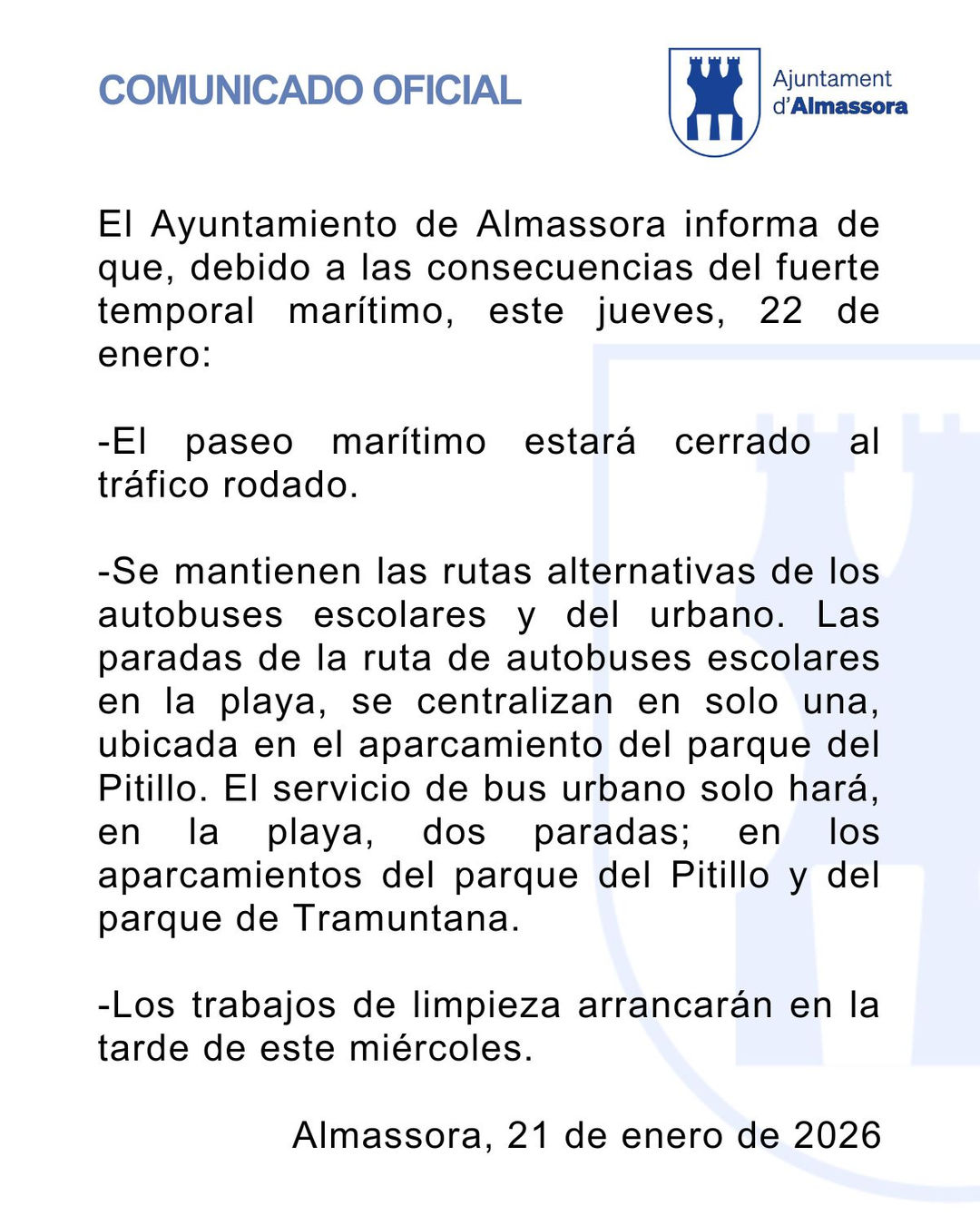 COMUNICAT 21 DE GENER.jpgDijous, 22 gener 2026 COMUNICAT DE L'AJUNTAMENT D'ALMASSORA DAVANT EL FORT TEMPORAL MARÍTIM QUE ASSOTA LA PLATJA 22 DE GENER