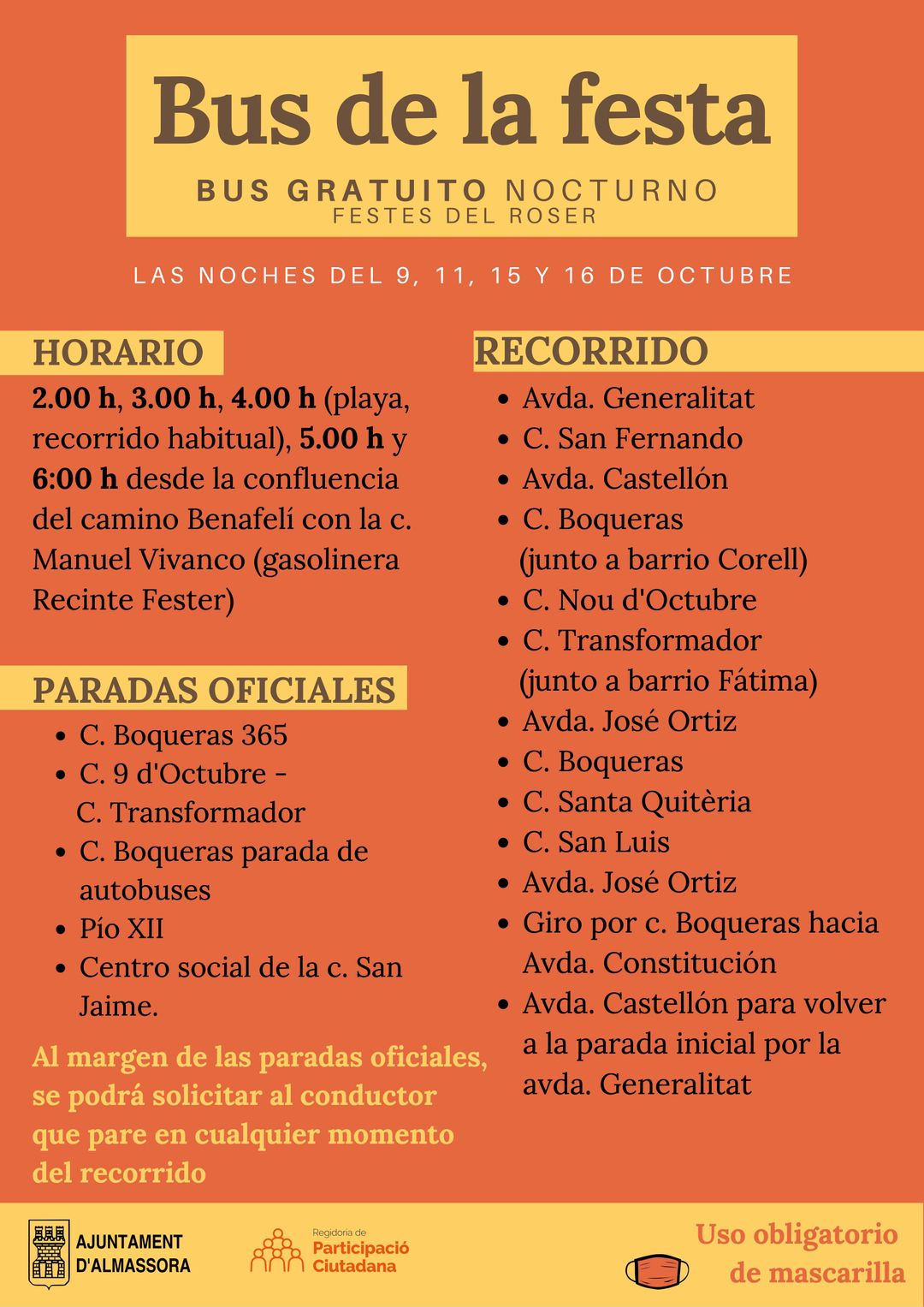 D'altra banda, l'Ajuntament d'Almassora ofereix aquesta nit el servei de Bus Fester per a totes aquelles persones que vulguen desplaçar-se fins als nuclis de festa amb seguretat. Té eixida a les 2.00, 3.00, 4.00, 5.00 i 6.00h des de la confluència del camí Benafelí amb el carrer Manuel Vivanco. Disposa de cinc parades oficials (carrer Boqueres, 9 d’Octubre, Transformador, Boqueres, Pius XII i centre social Sant Jaume), però qualsevol persona que ho utilitze pot sol·licitar al conductor que pare en qualsevol moment del recorregut, tal com ha indicat la regidora de Participació Ciutadana, María Luisa Renau.