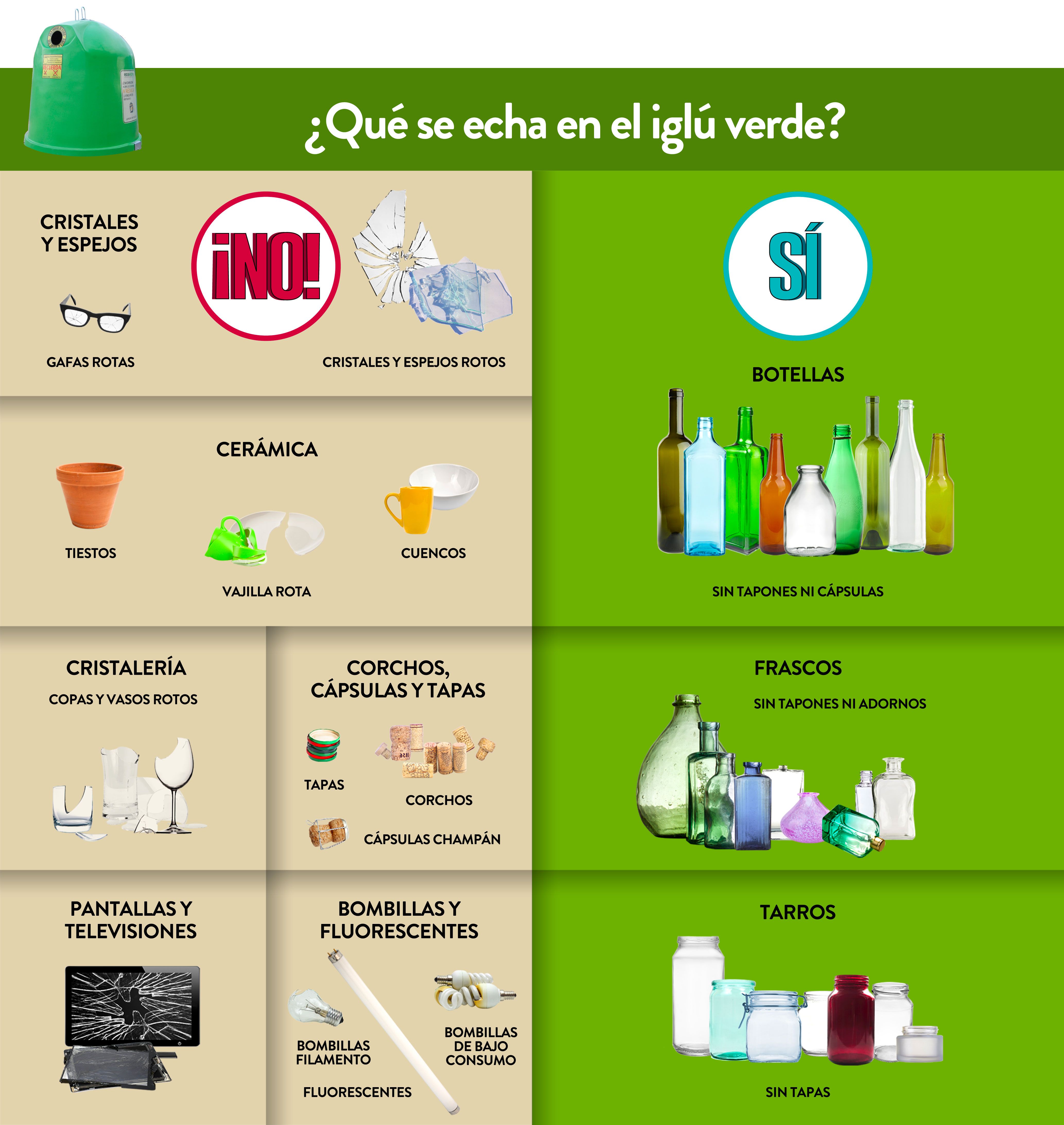 Altres materials de vidre, com per exemple, copes o gots trencats, espills, vidre pla, etc. no han de dipositar-se en aquest contenidor, sino que han de ser portats a l’Ecoparc per a la seua correcta gestió.
