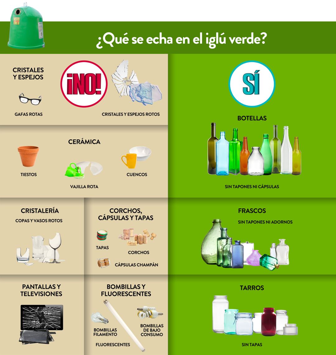 Els contenidors de vidre estan destinats principalment a la recollida d’ampolles de vidre, indiferentment de quina siga la seua naturalesa (ampolles de cervessa, de vi, de refresc…), així com de pots de vidre (els quals han de ser dipositats sense tapa metàl·lica).