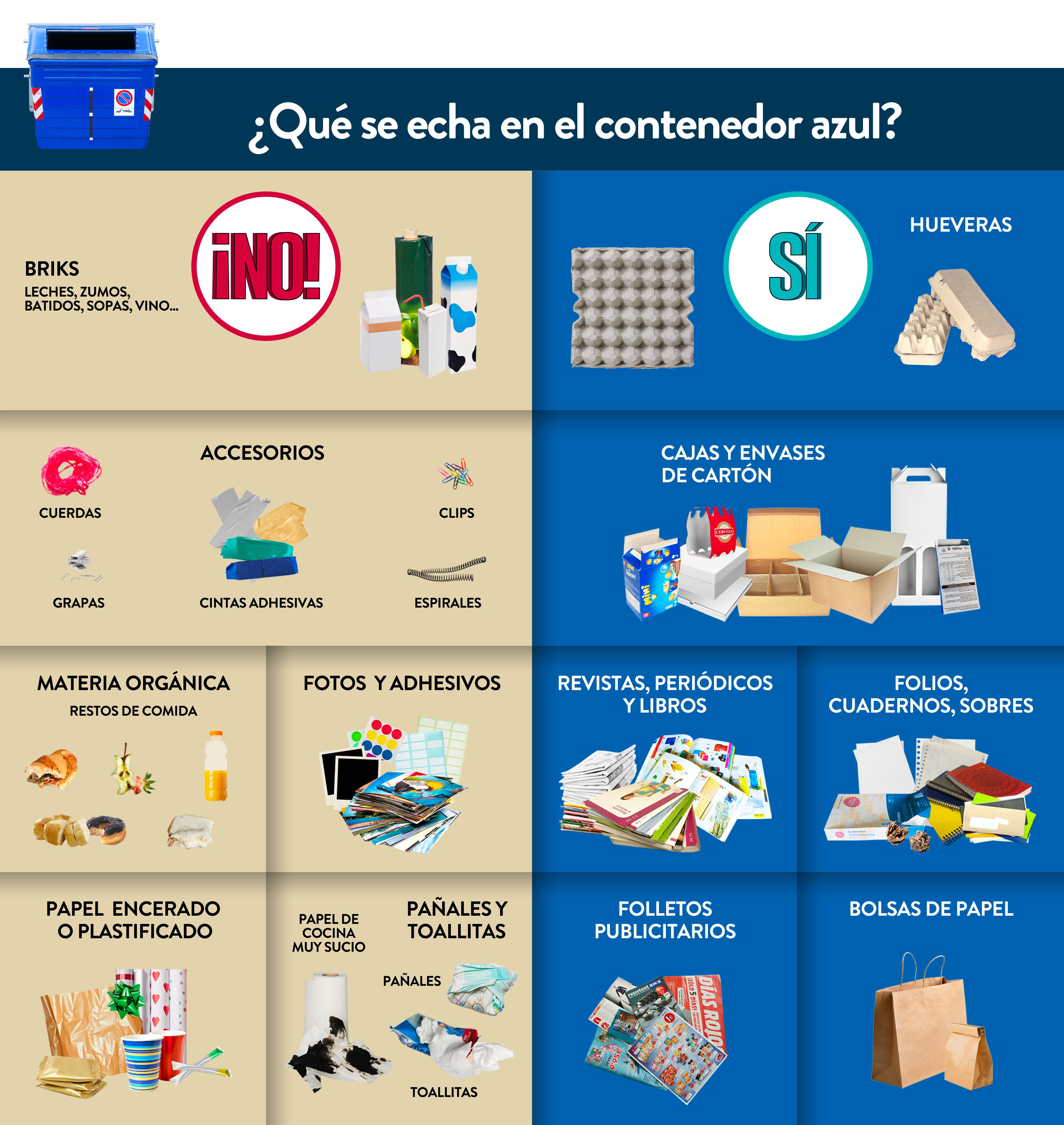 Aquests contenidors estan destinats a la recollida de qualsevol producte que estiga format per paper i/o cartró. Els residus habituals d’aquest contenidor són periòdics, revistes, paperassa, capses de cartró (d’aliments o de paqueteria i embalatges), gots de paper (de café i d’hamburgueseries), publicitat, sobres de cartes, i en resum, qualsevol producte format principalment per paper i/o cartró.