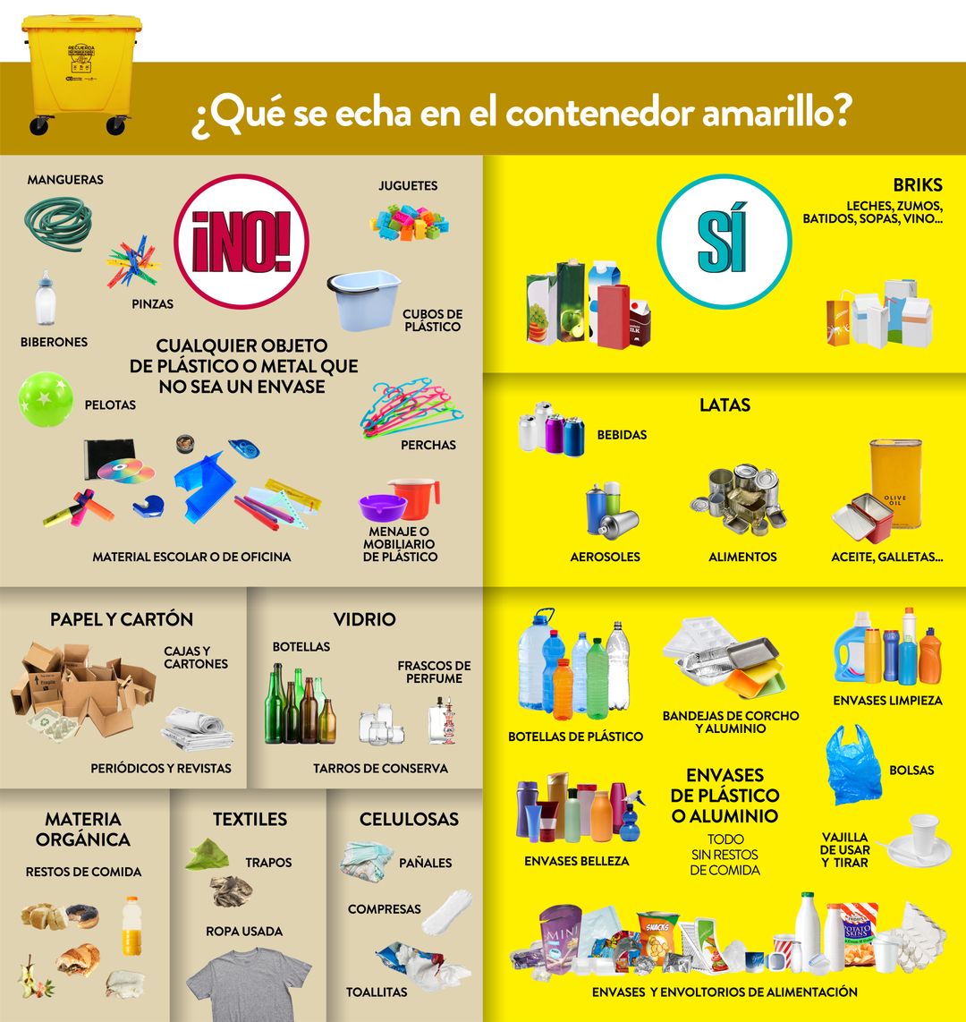 En aquests contenidors es dipositen, principalment, els envasos, envoltoris i recipients de productes, tant alimentaris com d’altres tipus, que estiguen composats per plàstics o alumini, així com els “bricks”. Una de les errades més habituals és abocar en aquest contenidor qualsevol tipus de plàstic i/o metall, incloent joguines, CDs, cables, aparells electrònics, bolígrafs, i fins i tot bolquers usats. Aquests residus no poden ser reciclats i per tant obliguen a la seua separació abans del reciclatge o, en cas contrari, redueixen la qualitat del producte final, fent que el material resultant no siga aprofitable com a matèria primera.