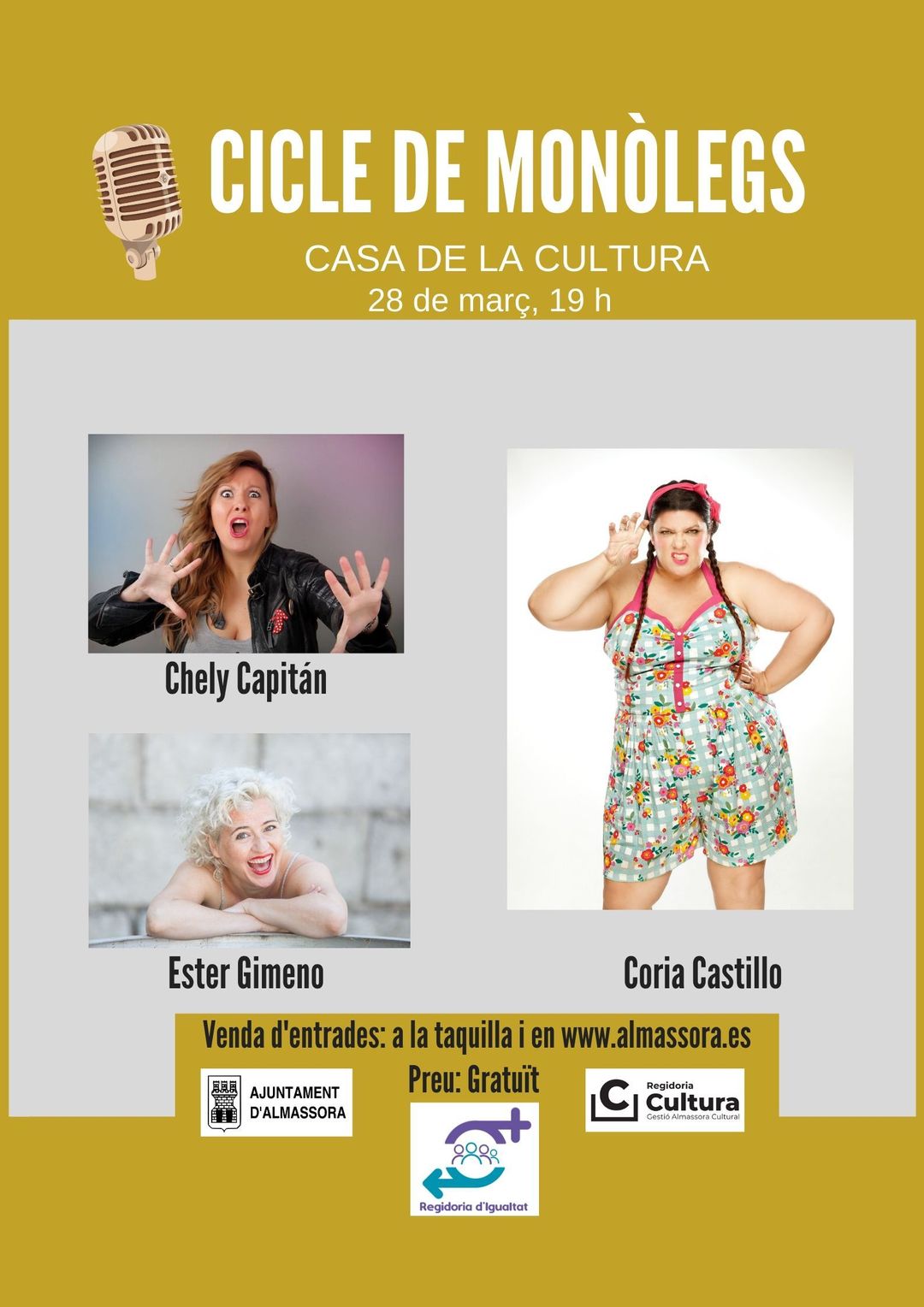 Dilluns, 24 febrer 2020Monòlegs amb Còria Castillo, Chely Capitan i Esther Gimeno 28 de març, dissabte, 19.00 hCasa de la CulturaGratuït. Accés limitat a la capacitat de la salaOrganitza: Regidora d'Igualtat
