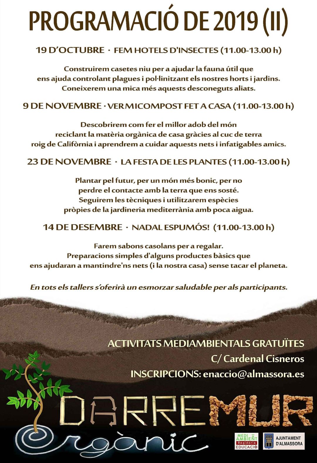 Aprenem el valor de la natura interactuant amb ella. A "L'hort de tardor" els xiquets i xiquetes d'Almassora aprenen a plantar i collir l'hort a l'estil tradicional alhora que es diverteixen jugant amb la terra. Així mateix, se'ls transmet el valor dels cicles biogeoquímics i entenen que a la natura tot està interrelacionat. Al final del taller, els i les assistents poden endur-se una part de la collita a sa casa com a recompensa del seu esforç.
