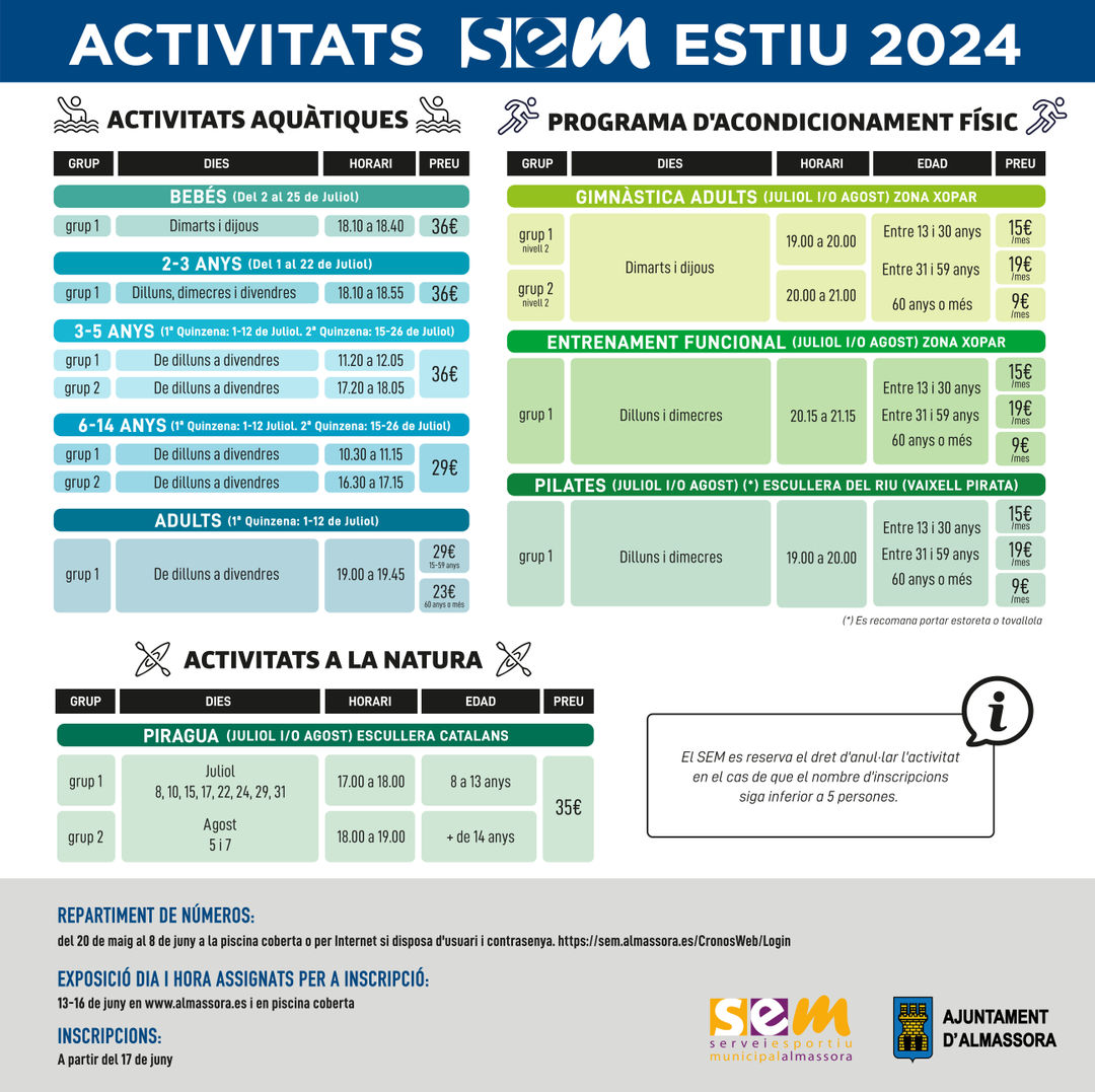 El Servei Esportiu Municipal (SEM) de Almassora ha abierto este lunes el reparto de números para inscribirse en las actividades deportivas para este próximo verano. Así, hasta el 8 de junio se puede acudir a las instalaciones del SEM, situadas en la piscina cubierta, u obtener la cita por internet si se dispone de usuario y contraseña en la siguiente dirección https://sem.almassora.es/CronosWeb/Login