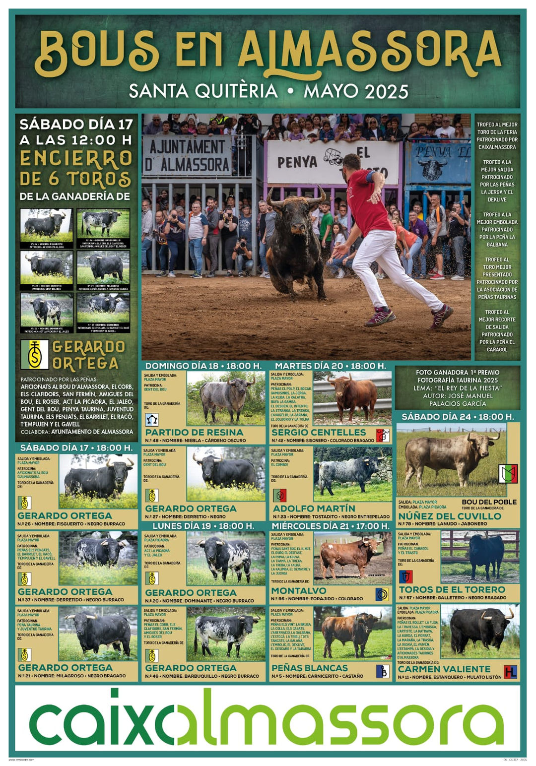 Los toros de la destacada ganadería onubense de Gerardo Ortega protagonizarán el encierro cerril, que tendrá lugar será el sábado 17 de mayo, a las 12.00 horas, por el recorrido habitual. Los astados están patrocinados, con la colaboración del Ayuntamiento, por las siguientes peñas: Aficionats al Bou, Els Penjats, El Barrilet, El Raco, T’Empujen, El Gavell, Penya Taurina, Juventud Taurina, Gent del Bou, A.C.T. La Picaora, El Jaleo, El Corb, Els Clafidors, San Fermín, Amigues del Bou y El Roser.