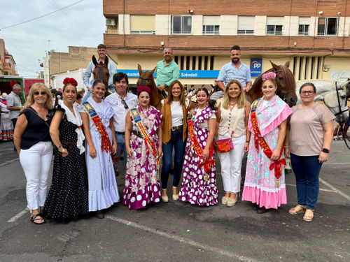 La alcaldesa de Almassora, María Tormo, acompañada de la reina de las fiestas, Sara Benet, su corte de honor y representantes de la corporación municipal, ha deseado un feliz trayecto a jinetes y romeros, en su camino al paraje de Santa Quitèria.