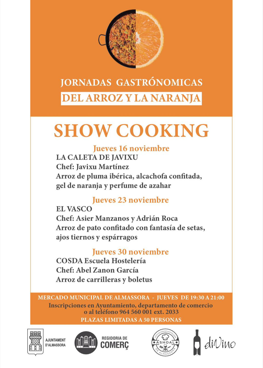El Ayuntamiento de Almassora organiza las Jornadas Gastronómicas del Arroz y la Naranja con tres showcookings en el Mercado Municipal, a cargo de conocidos cocineros. La actividad tendrá lugar los próximos jueves de este mes de noviembre de 19.30 a 21.00 horas.