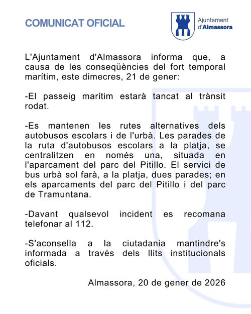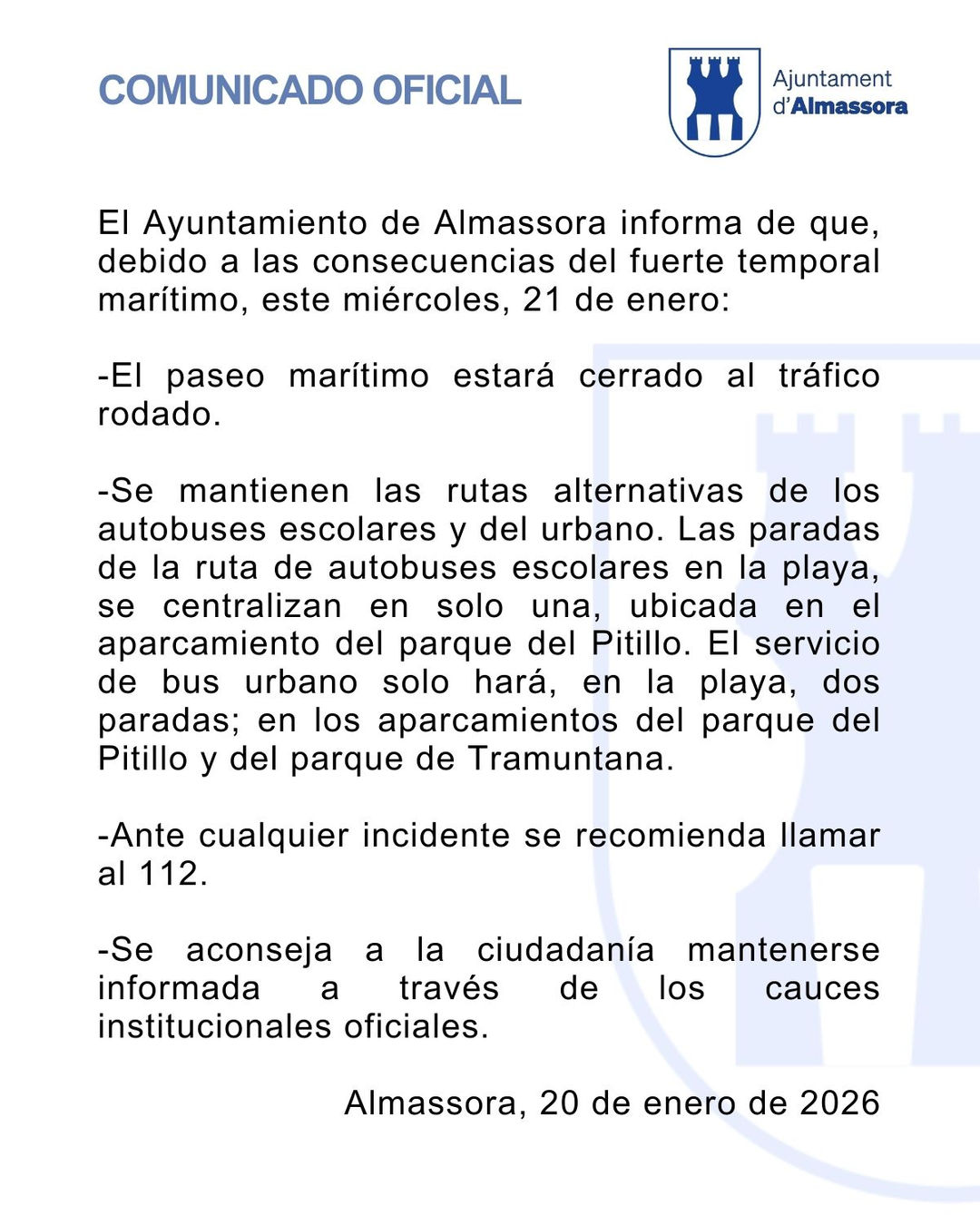 Martes, 20 enero 2026 COMUNICADO DEL AYUNTAMIENTO DE ALMASSORA ANTE EL FUERTE TEMPORAL MARÍTIMO QUE AZOTA LA PLAYA