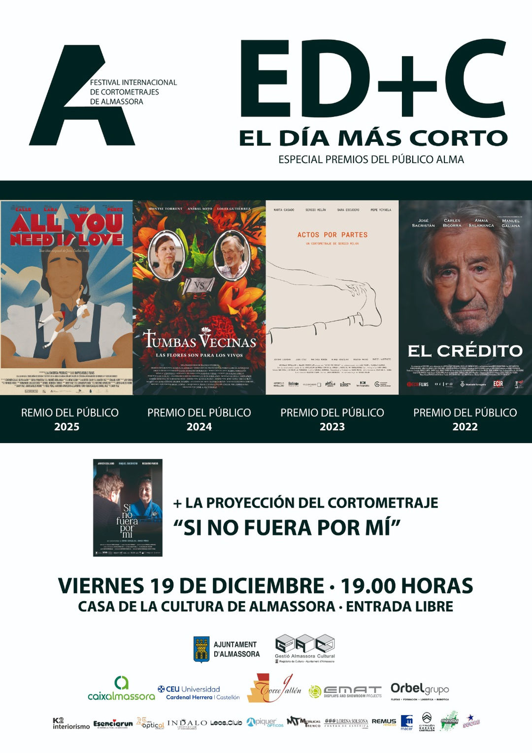 Durante la sesión se proyectarán los trabajos galardonados en los años 2022, 2023, 2024 y 2025 en esta categoría, una selección que refleja la diversidad temática, la calidad artística y la conexión que estos cortos han logrado con los espectadores del festival. Además, la jornada incluirá la proyección del cortometraje Si no fuera por mí, codirigido por Sergi González, director del Festival ALMA, completando una programación pensada para todos los amantes del cine.