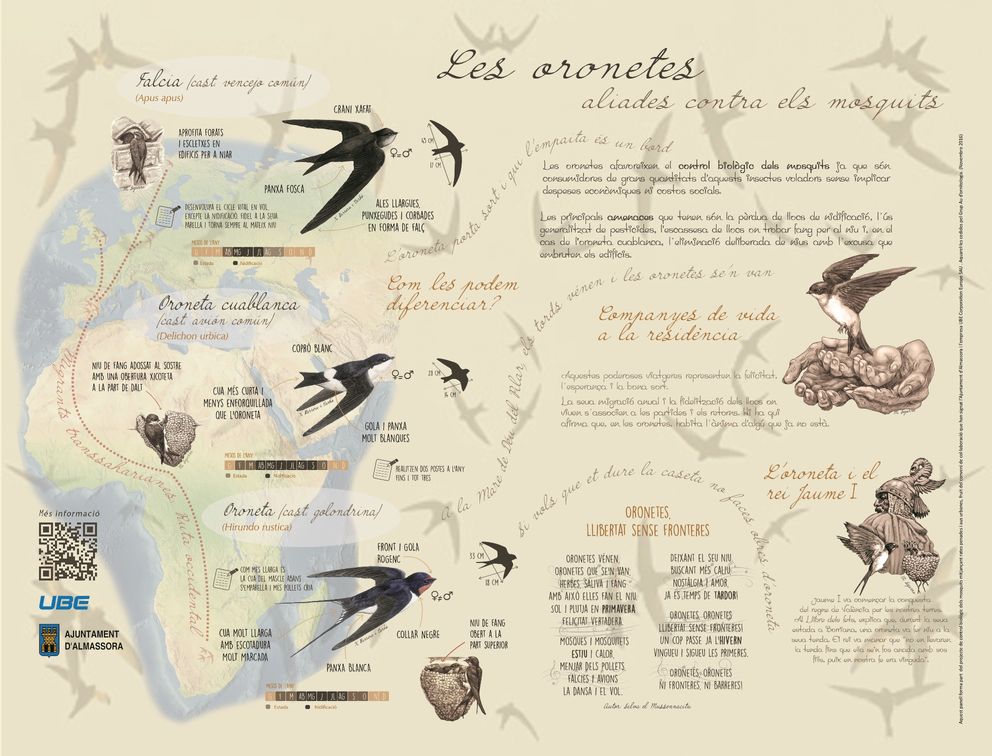 Además, el departamento instalará un panel informativo sobre las golondrinas para conocer su función de control biológico sobre los mosquitos y también saber distinguir las diferentes especies. El contenido hará referencia al valor simbólico de las aves y servirá para apoyar la labor divulgativa y educativa que el personal de la residencia desarrolla con los escolares de Almassora.
