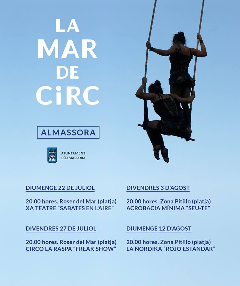 Así pues, el espacio cultural del Roser del Mar acogerá este domingo la representación de la función ‘Sabates en l’aire’, de la compañía Xa Teatre, que comenzará a las 20.00 horas. En el mismo punto se desarrollará la pieza “The Freak Show” por parte del elenco de Circo la Raspa, prevista para el próximo viernes 27 de julio. La Mar de Circ trasladará al parque de Pitillo la actuaciones del mes de agosto, de modo que ‘Seu-te’, del grupo Acrobacia Mínima, se representará el viernes 3 de agosto y ‘Rojo Estándard’, de la compañía La Nórdika, llegará al distrito marítimo el domingo 12.