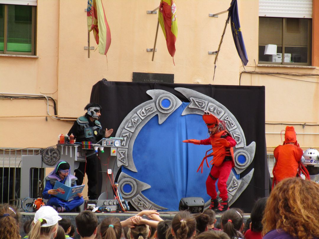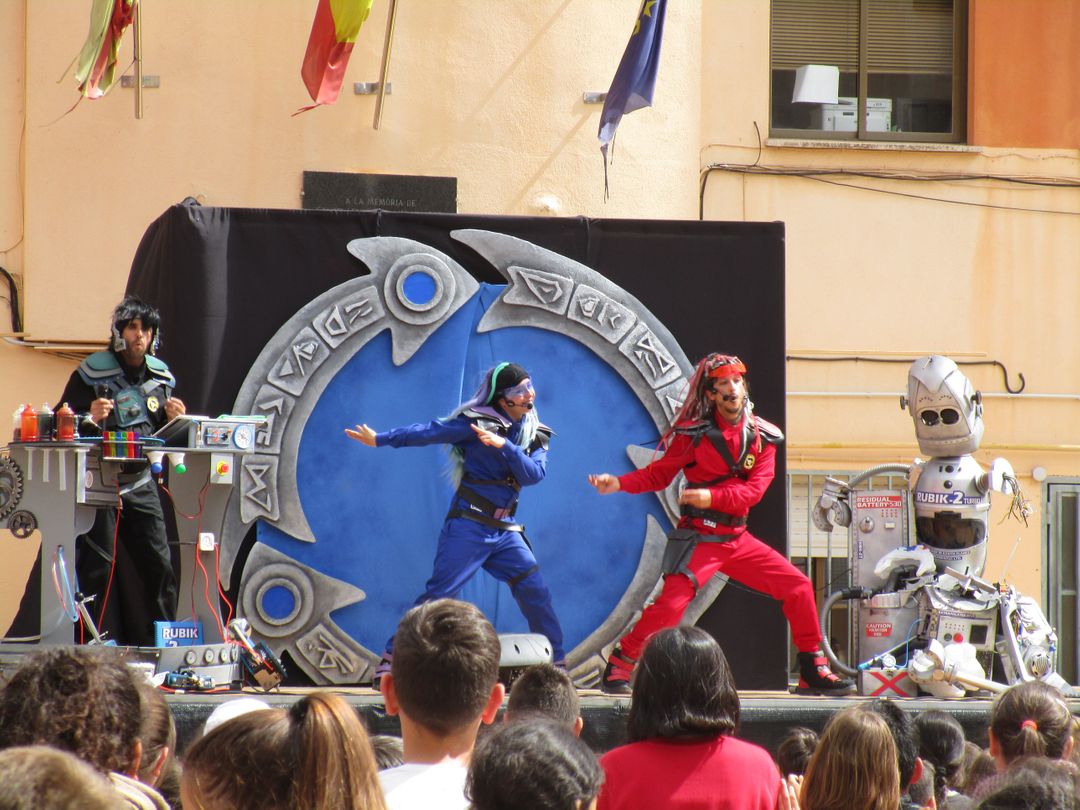 Al finalizar los talleres, se realizó la representación del espectáculo ECODISSEA (versión 2019) en los colegios. En esta ocasión, los cronoviajeros vienen desde el año 2580 para rescatar a RUBIK, un robot cronoviajero cuya misión era volver al año 2019 para recoger datos, pero del que han perdido la pista. Al llegar descubren que RUBIK ha sido infectado con el virus de la consumitis, que le lleva a realizar un consumo irresponsable, y que amenaza con destruir sus circuitos... ¡y la vida en la Tierra! Con la ayuda del público, los cronoviajeros combatirán este virus y nos enseñarán pautas de consumo responsable para poder salvar a la humanidad del futuro.