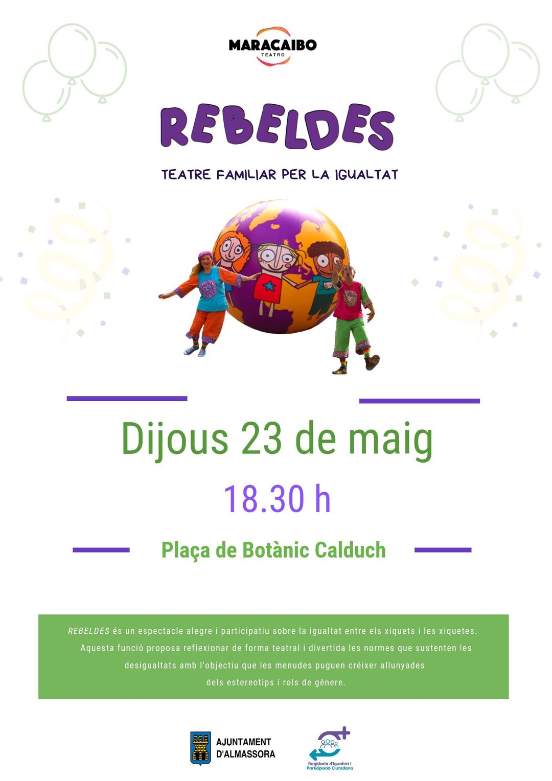 Descripción. Espectáculo alegre y participativo sobre la igualdad entre los niños y las niñas, las mujeres y los hombres. Esta función propone reflexionar de forma teatral y divertida, las normas que sustentan las desigualdades con el objetivo que las pequeñas puedan crecer alejadas de los estereotipos y roles de género.